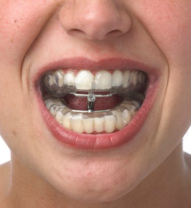 Dispositivo intraoral a medida para tratar los ronquidos y la apnea del sueño mediante un adelantamiento controlado de la mandíbula durante la noche para facilitar el paso del aire por las vías aéreas superiores. Permite realizar todo tipo de movimiento de la boca. Consta de un conjunto de dos férulas unidas entre sí a través de un sistema de ajuste regulable que permite el adelantamiento progresivo de la mandíbula